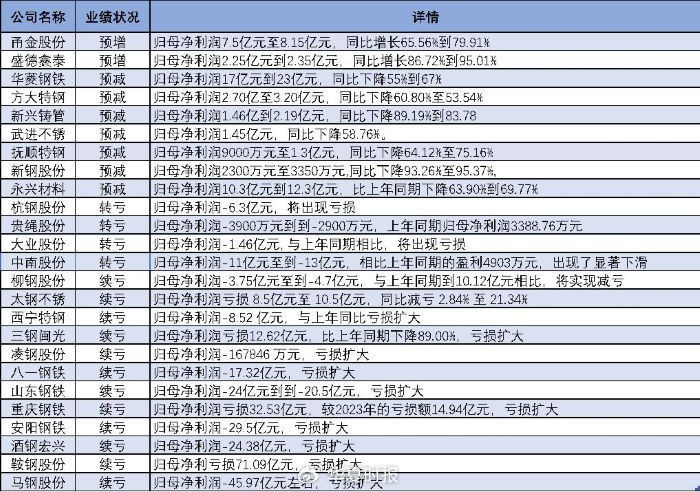 《华夏时报》记者对近期发布业绩预告的25家钢企业绩数据进行了统计,发现2024年不少钢铁企业的亏损金额显著增大,超半数将出现亏损,重庆钢铁近三年的亏损金额直逼60亿元,鞍钢股份近两年的亏损金额超过100亿元;仅有甬金股份和盛德鑫泰预增。