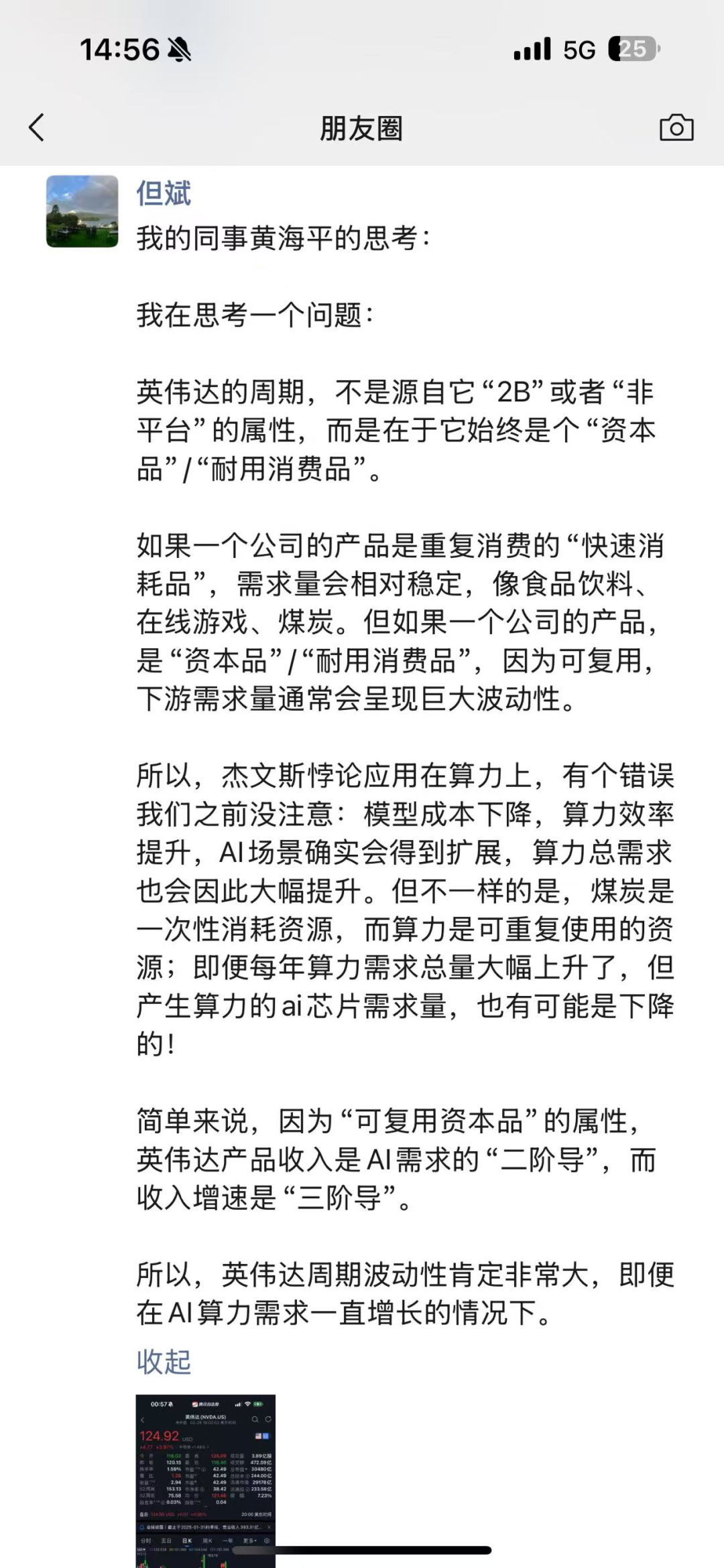 据华尔街见闻,但斌近日在朋友圈分享了其同事黄海平的一段思考,直指英伟达的“命门”——并非“2B”或“非平台”属性,而是其“资本品”/“耐用消费品”的本质。