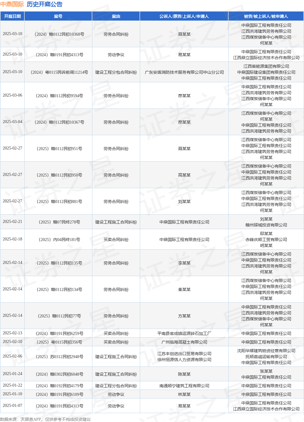 案号:(2025)苏0312民初2948号审理法院:徐州市铜山区人民法院案由:建设工程施工合同纠纷当事人信息: 原告/上诉人:江苏丰创进出口贸易有限公司、徐州恒源信人力资源有限公司 被告/被上诉人:沈阳华耀建筑物资经营有限公司、抚顺嘉诚运输有限公司、中鼎国际工程有限责任公司开庭日期:2025年2月6日根据统计,近一年内以中鼎国际工程有限责任公司为当事人的历史开庭公告有64则,其中案由为“建设工程施工合同纠纷”的公告以15则居首,其次为“买卖合同纠纷”有11则,“劳务合同纠纷”有9则。历史开庭公告(前20条)如下: