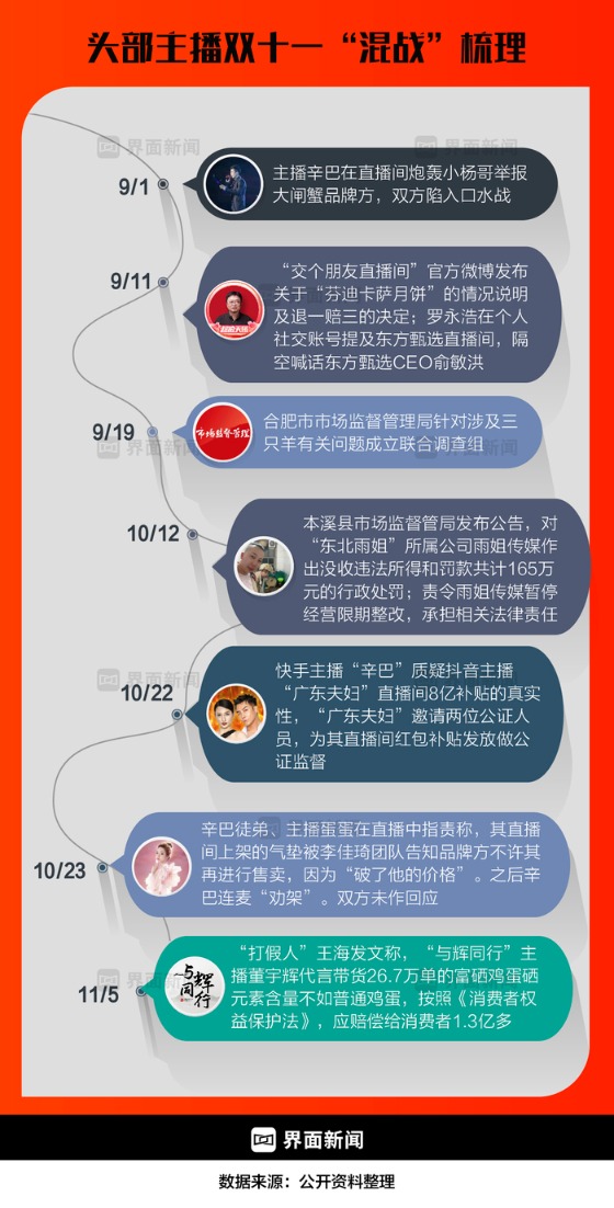 本该与辛巴李佳琦一同竞争的选手里,新晋主播董宇辉今年刚刚离开东方甄选,双十一并不是他的主场;9月底,“疯狂小杨哥”因虚假宣传被调查,缺席了冲刺销量的最好时机。而还有一些主播,早已在直播间失去姓名。